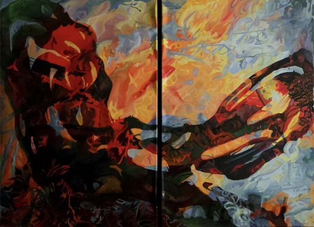 two parts, 2 x 60x90 cm, oil on canvas, partly worked as a relief