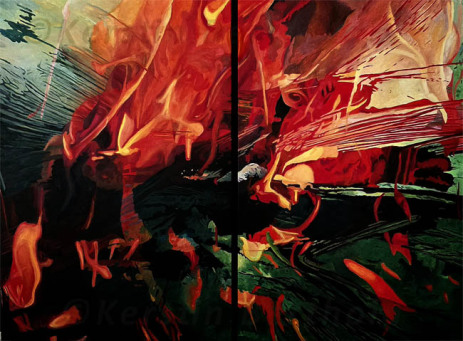 Charakteristisch ist eine bandartige Struktur, die sich meist in runden, organischen Formen durch die Bildtafeln zieht. Diese Bandstruktur wirkt wie ein Körper oder ein Schatten des Feuers. Ein Schatten, der in seiner Dynamik zugleich mit den Flammen verwoben als auch Gegenspieler ist, kontrastiert die Dynamik der Energie.